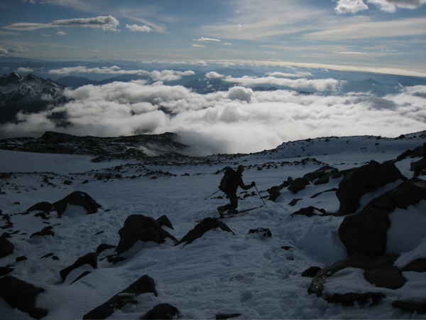 We were all in front and behind at some point on the Snowfield yesterday. Scots was right---creamy soft-spread butter on the upper 1500' or so, then a bit grabby/scritchy to the transition point. I'm liking the way the fall snowfields up high gradually get better.