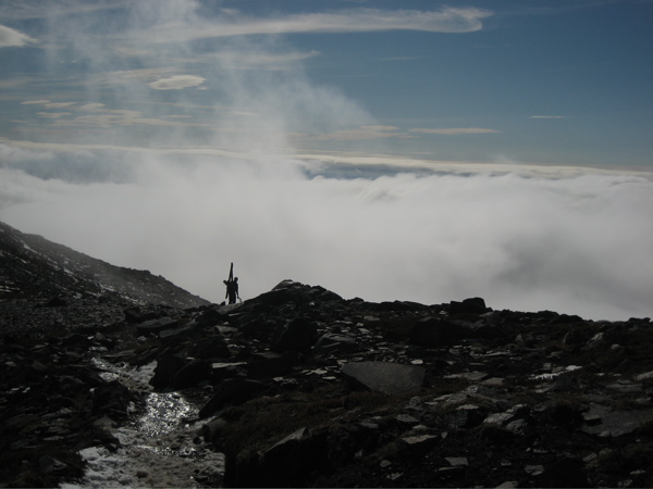 No rocking of bases. Just one narrow little rock band to pick through. It was wonderful compared to Sept trip to Muir -- sun cups were filled in the whole way, creamy on top of skitchy hard stuff at the lower end, and 4 to 6 inch windpacked at the top end. Great variety of weather and interesting clouds and gusts from various directions. Thanks Telemakc for chasing down my hat. Crevasses not apparent now but other TR says they are still not all filled solid. Great company!