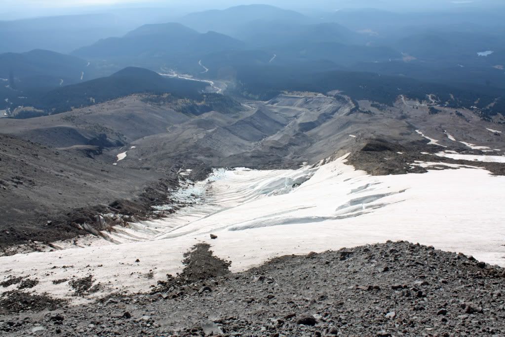 Across the way, a snow cat was pulling about 10 people up the Palmer so they could do "laps" as the lifts weren't running today. It looked like a few skiers and some alpine carving snowboarders. I mostly stayed on the ridge, as the rock fall off the ridge onto the lower glacier was hideous. I ended up climbing to about 9200 feet (didn't use ice axe or crampons but did have them) and decided to call it, since the snow was getting more and more suncupped. Here's a shot of the glacier from just below my high point....