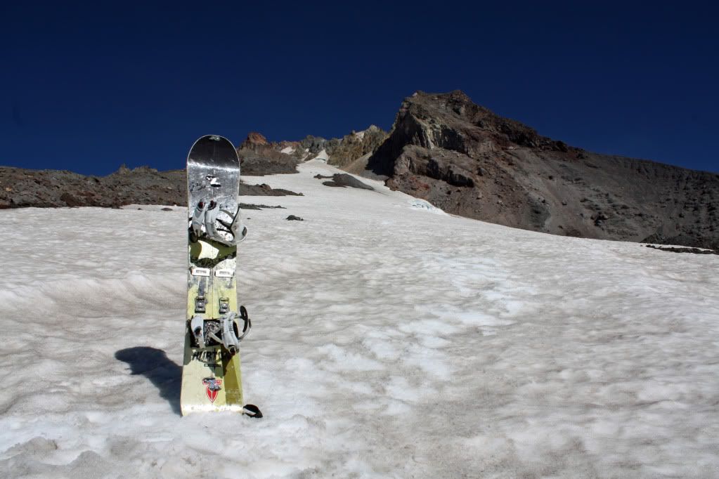 The ride down was mixed - the snow was barely corned on the upper half of the snowfield, but was pretty good on the lower half down to the Palmer. There were some intermittent ice patches mixed in as well. I did use the ice axe on the way down to gain some extra mental support since a fall in the first few turns could have resulted in a slide down towards exposed crevasses. When I got to the bottom (about 700 feet vertical), I snapped the below shot before walking over to what's left of the Palmer. I had to prop the board up with the ice axe to get it to stay vertical.