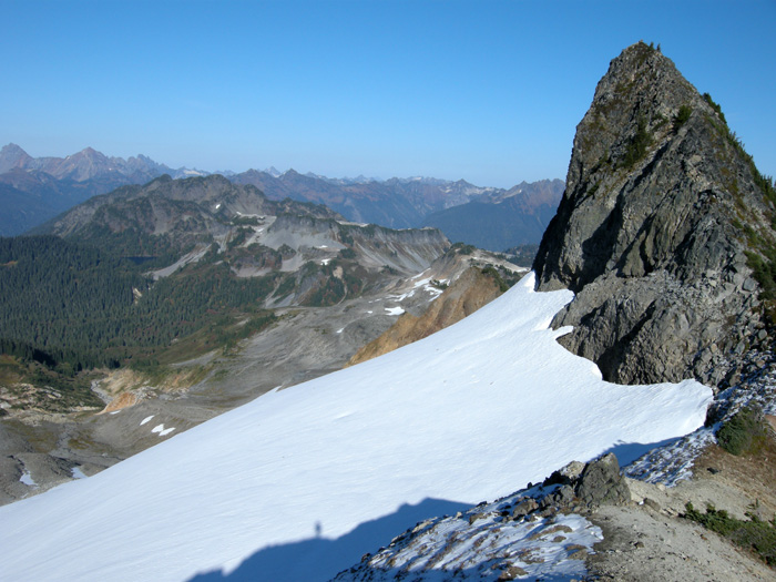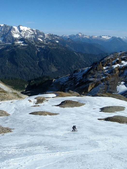 Unbelievably beautiful day, and excellent company to help me celebrate a milestone. Lara P., Chuck, and his son Jake (a first-time TAYer) made the drive to Artists Point from Edmonds to head out toward Coleman Pinnacle area. Sun, mild temps, HUNDREDS of pedestrians, and some servicable patches were all seen along the way. At the corner to turn into the basin below the Pinnacle (where all the goats usually are...) we decided that the small patch below us would be sufficient for our celebratory turns. Nice dust-on-crust (really chattery, though), first (only?) tracks, and near-sunburn conditions helped out with the Joy-O-Meter. We were surprised to see very few brethren and sisteren out there. A very nice way to ring out the end of Year 13, and look forward to La Nina blowing in Year 14 next month!!!!