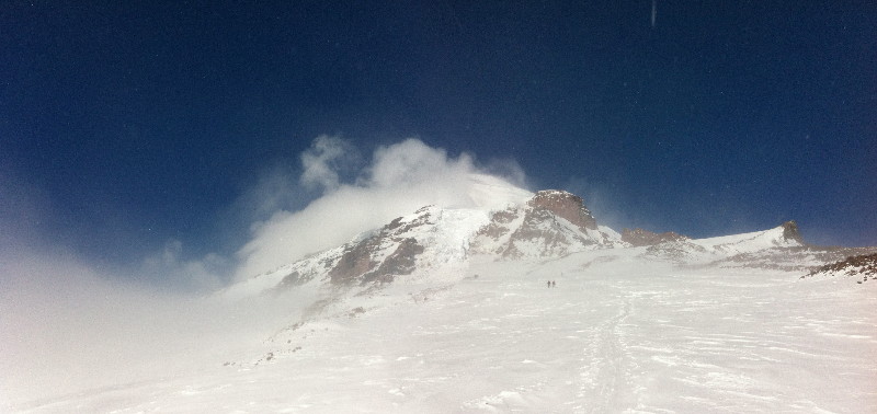 About 8K the weather cleared. The top 1000' from Camp Muir was a mix of melting crust and corn patches.