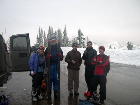 When we reached Paradise, I thought I had made a wrong turn into the Crystal lower lot. Upon arrival at Paradise, our group immediately split into two parties of 3. The "A" team of Snow Bell (Joe - AT gear), Moscawulff (Brad - Hot new Tele gear), and Dan (Split boarder) aimed at Muir. The "B" team of Joe, (Tele), Molly (Snowshoe/Snow Board) and Rusty Knees (Don, Tele) decided what we need is a good cardio workout, and some basic "face plant" practice.