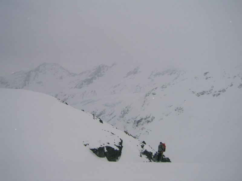 Those cornices were freaky. I followed a fracture along the ridge that was 10 ft from the edge, an inch wide for about 50 ft until the wind in snow made it disappear again. When they go it will be a site to see!