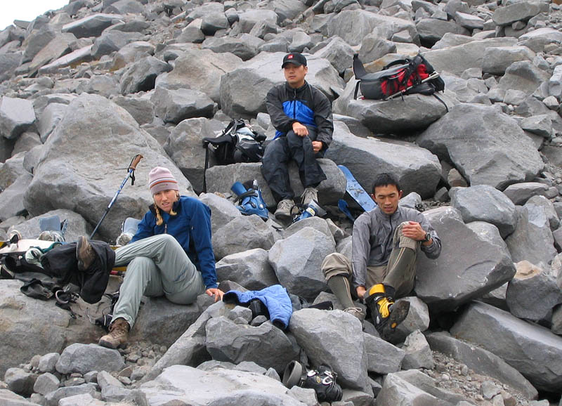 Skiing water flowing over blue ice was definitely a new condition for me! I have to say, I prefer it to inverted moguls (or sun-bathtubs, as I heard them aptly named) filled with years of ablated dirt though. I would definitely recommend that anyone making the slog to the 10,000 foot mark, leave your dominatrix at home because you will be getting spanked! I haven't seen suncups that bad since I skied Adams a couple of years ago around this time. A few hundred feet down fr...