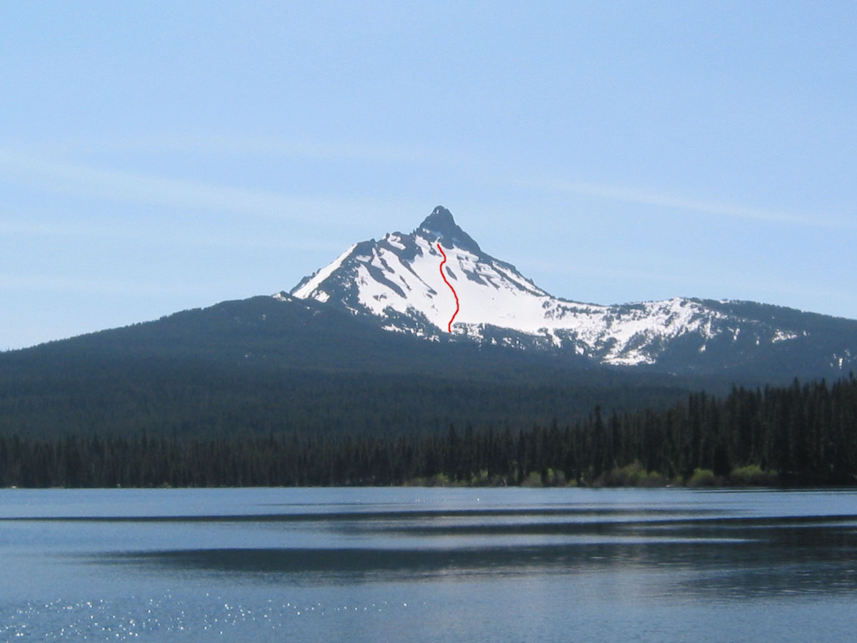 Mount Scott mirrored in the waters of Klamath Marsh, located just east of Hwy 97. This photo was taken the day after our ski descent, unfortunately late in the afternoon (it should have been a morning shot). The view looks west, and the Southeast Chute is the prominent showy chute angling down and left below the summit.