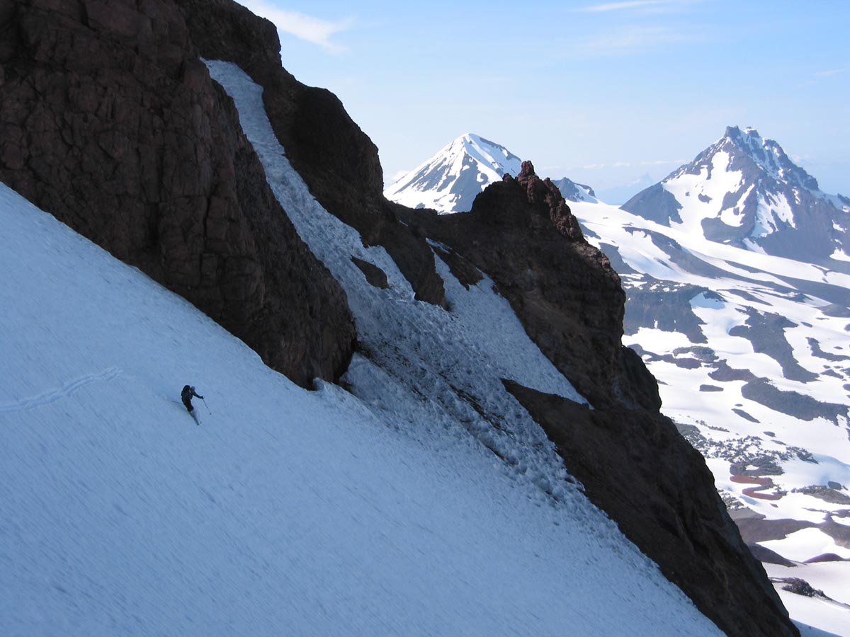 Sky launches down the moderate 40-45 degree slopes of the main chute above the Prouty Glacier, after our traverse left out of the much steeper southern chute. In the background are Middle and North Sisters.