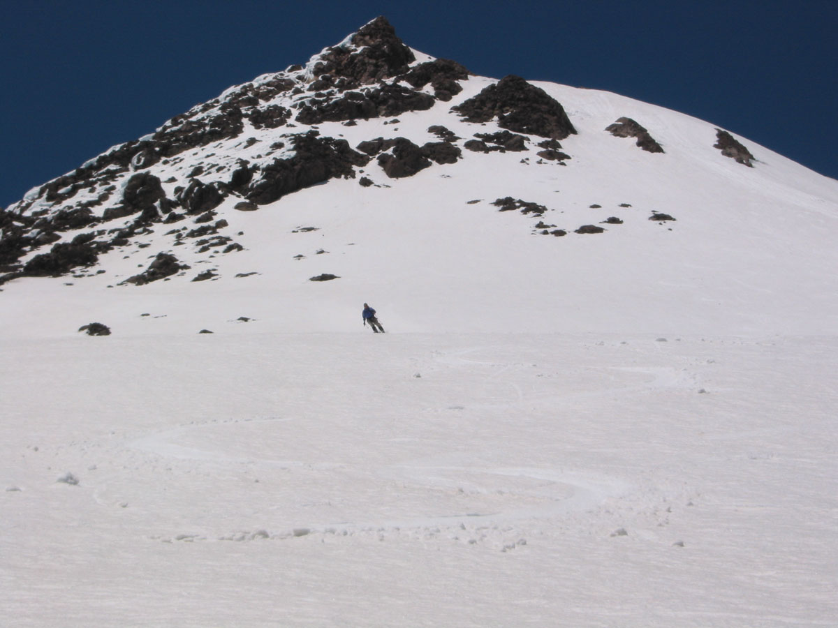 Allow me to expound on Kam's message with an emphasis on 'perfect snow'. Starting down at noon, the top 4,500 feet held incredible, mostly untouched corn; outside of the area between the caldera and the bridge over Easton's bergschrund, which was highly trafficked, the snow was virtually unsullied by post-holers beyond the primary climber's track. It was turn after turn after turn. Beautiful.