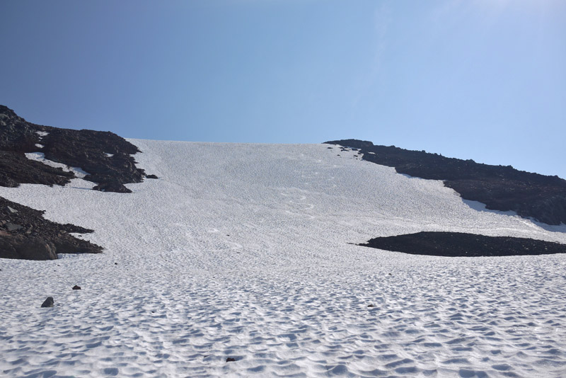 I did not bring crampons and I was pushing it a bit on the last pitch below Observation Rock. Crampons and ice axe would have made the pitch much easier going (did have a whippet btw.). Note that the pictures do not quite show how steep the slope is. There was no way to skin the slope.