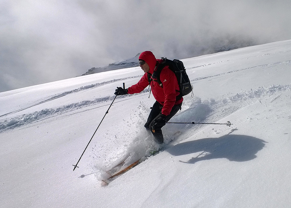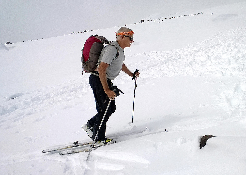 Once again you don't know if you don't go! Given the weather forecast, I was thinking of pushing the ski day back to Friday but Greg only had Thursday available. So I added full goretex to the pack and joined Greg and Mark for the ride to Paradise. David met us in the parking lot and we ended up finding 4-6" of creamy settled fresh snow smoothing the old base with blue sky and no wind above 7300'. We skinned from the car and were able to ski back (rock skis) to the creek crossing (at 5800') below Alta Vista where the snow had melted off the pavement. Good to get 20 years in the bag.