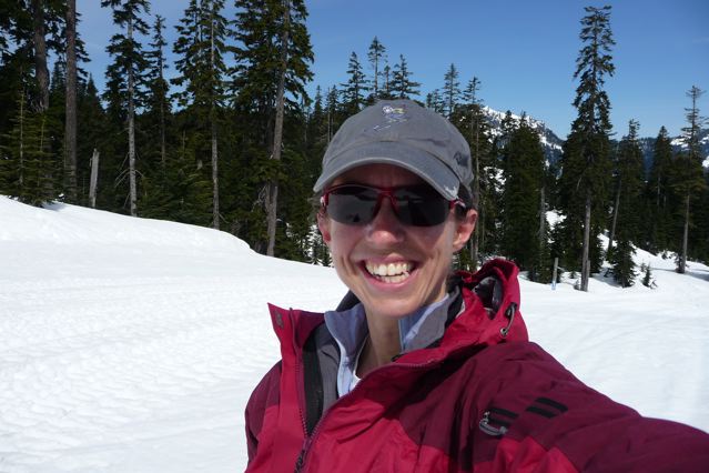 Today, ski and chica were reunited for the first time on a downhill slope! Yes, over the months I have tried various forms of snowsliding to include, one-ski teleturns at the local highschool during our epic lowland snow event this winter, a random assortment of sledding excursions and a few feeble attempts at turn/side-step but today, I skied for real--teleturns and all--hugging the Hyak side of Silver Fir chair on the lovely forgiving corn. I was expecting some mush, but a steady wind kept the upper slope surprisingly cool until 11 and the flatter shaded "hiway" continuing to the base held until noon without becoming grabby.